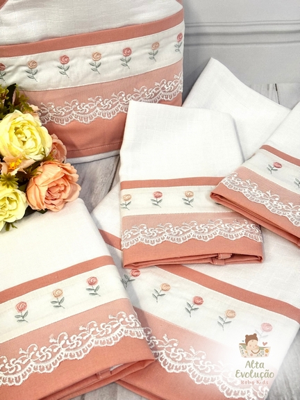 O bordado de mini rosas com detalhes em renda traz um visual delicado e elegante, perfeito para compor um enxoval feminino único e especial. Ideal também para presentear com sofisticação e carinho.