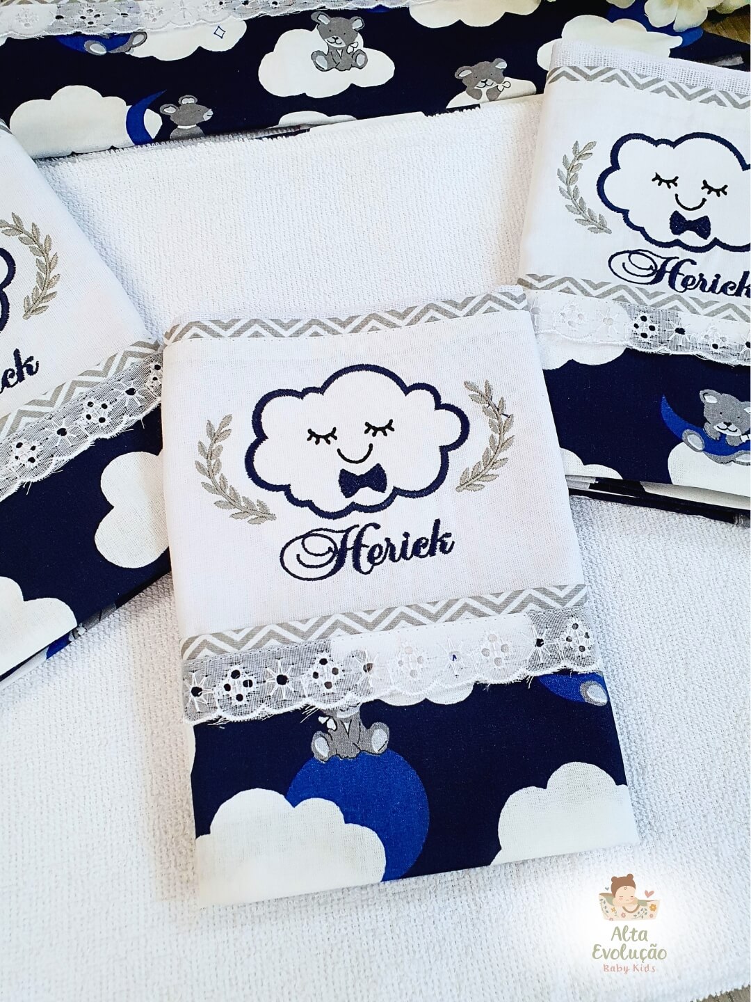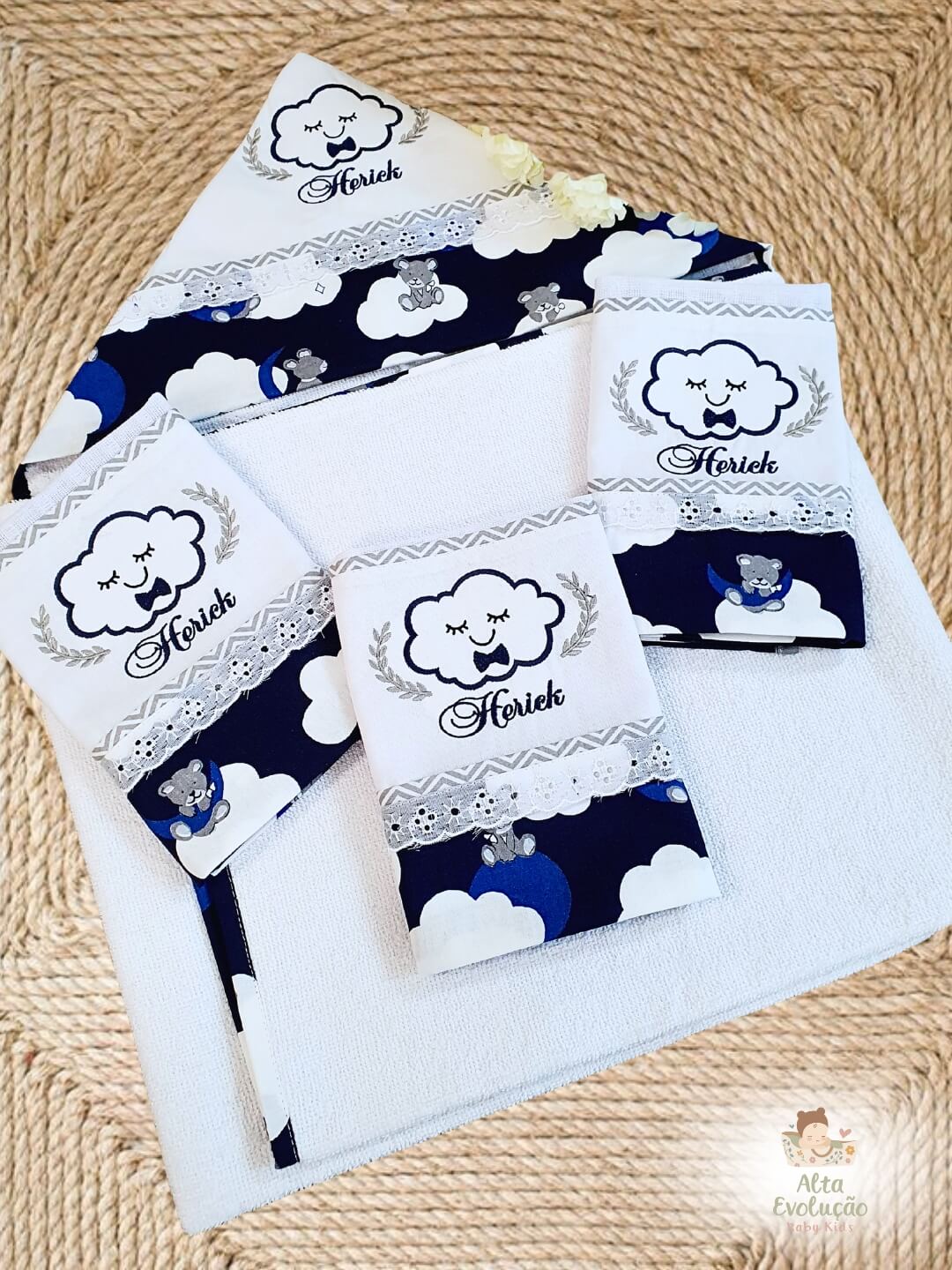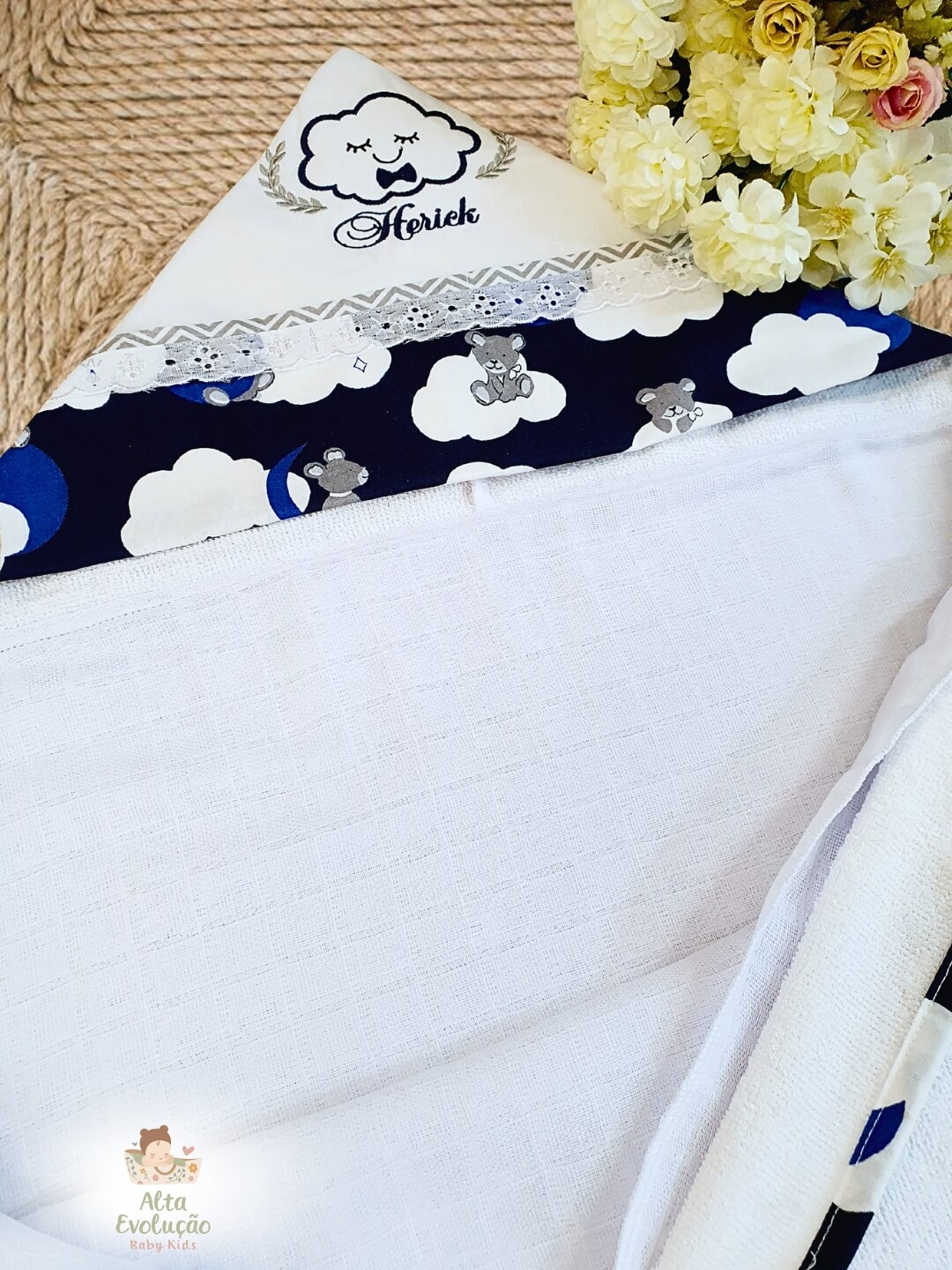 Nossos enxovais são confeccionados artesanalmente, com material premium 100% algodão, pensados para oferecer conforto, maciez e cuidado para a pele do bebê.