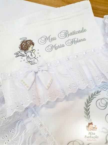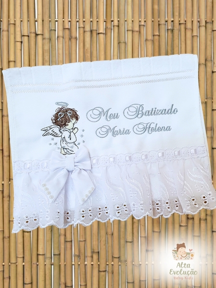 O bordado da anjinha, acompanhado de laço branco, confere um charme elegante e delicado, tornando a toalhinha perfeita para cerimônias de batizado ou como lembrança especial.