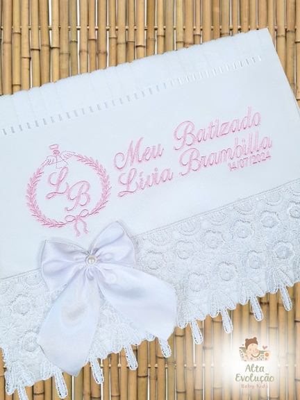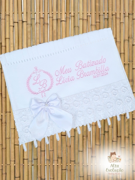 O bordado do brasão, acompanhado da inicial e do nome em rose, confere um charme sofisticado e personalizado, tornando a toalhinha perfeita para cerimônias de batizado ou como lembrança refinada.